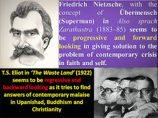 Q-1) What are your views on the following image after reading 'the waste land'? do you think that Eliot is regressive as compared to Nietzsche's views? or has Eliot achieved universality of though by recalling mythohistorical answer to the contemporary malaise ?